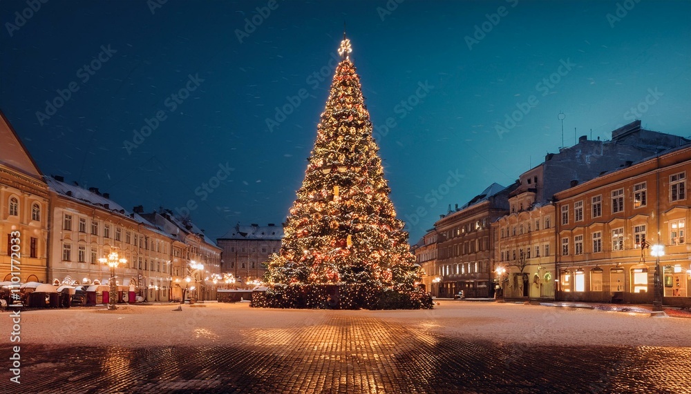 "Giant Christmas tree decorated with warm golden lights in the center of a European town square at night, snow covering the ground and rooftops, historic buildings in the background, cinematic lighting, magical holiday atmosphere, photorealistic, 8k resolution"