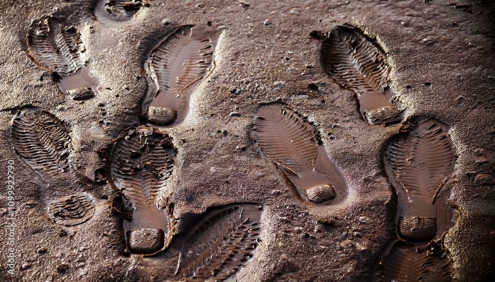 "Macro photography of clear boot footprints in wet mud, detailed sole tread patterns, glistening damp soil, standing water in depressions, dramatic side lighting, high contrast, forensic detail, photorealistic, 8k resolution"